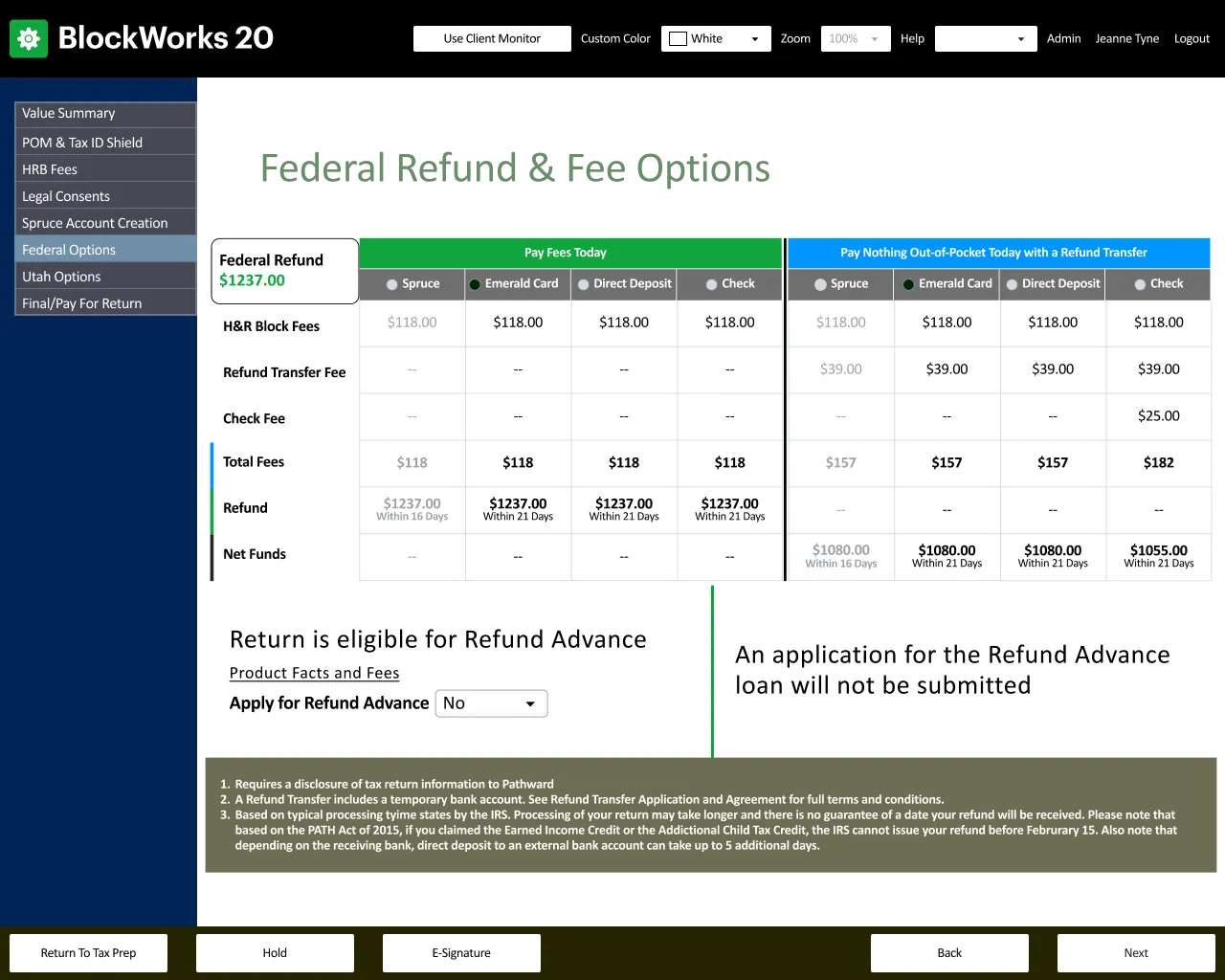 The Tax Pro needed enough context and detail to explain the offer confidently, answer questions, and move the flow forward without losing trust. The customer-facing monitor needed the opposite in key moments: simpler framing, less legal clutter, and clearer sign-up cues. The in-store handoff pattern, including QR-based sign-up support on the companion monitor, emerged from working through what information was legally passable and what was merely distracting.